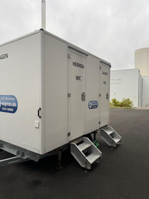Unser moderner und hochwertig ausgestatteter Komfort 4/1 Toilettenanhänger mit Tank gibt Ihrer Veranstaltung die richtige Note.