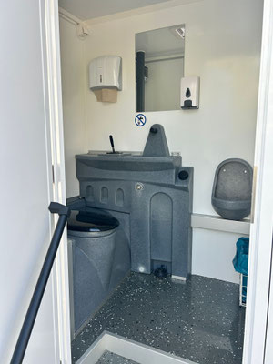 1 geräumige Toiletten, 1 Handwaschbecken mit Seifenspender und Papiertuchspender, Mülleimer, großer Spiegel, Heizung, Dachluke - 2 davon zusätzlich mit Urinal!
