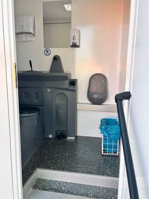 1 geräumige Toiletten, 1 Handwaschbecken mit Seifenspender und Papiertuchspender, Mülleimer, großer Spiegel, Heizung, Dachluke - 2 davon zusätzlich mit Urinal!