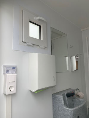 - 1 toilet, 1 hand basin with soap dispenser, large mirror, heating, roof hatch